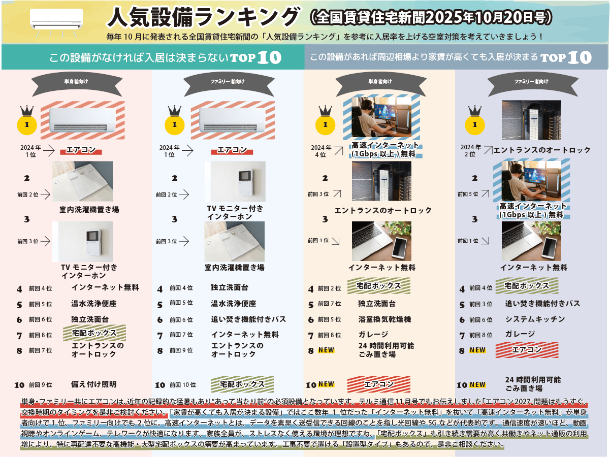 人気設備ランキング(全国賃貸住宅新聞2025年10月20日号)