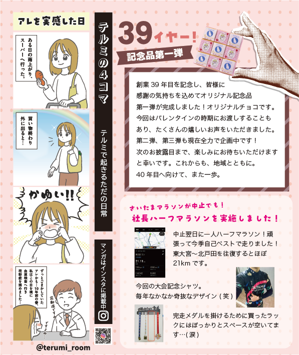 皆様こんにちは!年始にもご案内させていただきましたが、2月20日をもちましてテルミは創業39年目を迎える事が出来ました。これもひとえにテルミに関わる全ての方々のおかげです。心より御礼申し上げます。永続発展を目指すうえでは通過点ではありますが、お世話になった皆様への感謝の気持ちを込めて左記にもありますように今後も記念品等を企画しております。楽しみにしていただければと思います。